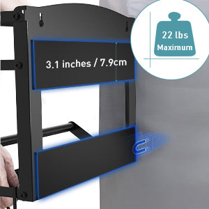 Holds up to 22 lbs. The magnet is very strong and does not move when taking items on or off the shelf.