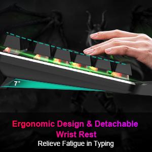 104 keys US layout keyboard with the help of a drain hole under the bottom, which can prevent damage from spilled drinks or coffee. Ergonomics arc keycap, smooth lines, give you a comfortable feeling and anti-fatigue when you gaming or typing. 2 folding stands to keep your hands in a more comfortable typing position, which will improve your typing speed, accuracy, effectively relieve your finger fatigue & ensure all-day comfort.