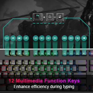 12 multimedia function keys, enhance efficiency during typing. 3 Customizable Chroma RGB Lighting modes(without driver), you can customize your favorite by yourself, just press FN+CM1-CM7. 5 fixed modes, RTS, FPS, COD, CF, LOL, It fits your game background. RGB Backlit Mechanical Gaming Keyboard 26 different RGB lighting modes, The colorful rainbow Backlit can bring you into a great gaming Keyboard atmosphere.