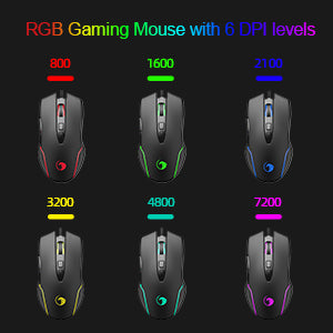 The wired laser 7200 DPI gaming mouse comes with custom driver software with 7 programmable profiles, including basic settings, DPI switching and colorful LED lighting effects. The lighting effects are adjusted by the brightness level and breathing speed. If the mouse stays out of work for 8 minutes, it will turn to power saving mode, press any button to restart it.