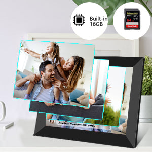 Built-in 16GB memory empowers a huge capability of storage. it is estimated to store over 40,000 photos of 300KB/pc in the frame. Received photos and videos are saved to the built in memory of the frame, which is much safer and private care.
