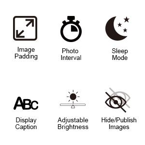 You can personalize the digital photo frame with your own preferred settings, such as image padding, hide/publish images, display caption, adjustable brightness, sleep mode, photo interval, etc.